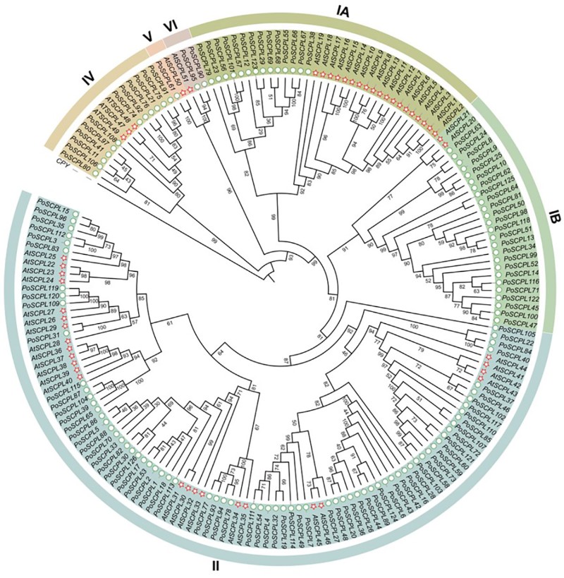 本研究首次在凤丹牡丹全基因组中鉴定到126个潜在的PoSCPL基因(图1)。系统发育分析表明,该基因家族可分为6个亚组(IA-VI),不同亚组中的分布并不均匀,Clade II拥有最多的基因(71个),而Clade V最少(仅有1个)。SCPL基因在Clade IB中的数量比拟南芥高7倍,在Clade IV中的数量比拟南芥高4倍。这些结果表明,SCPL基因在凤丹中发生了扩张。