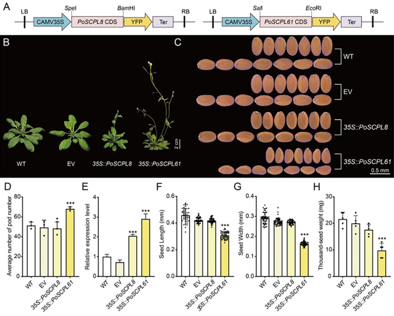 图3. 转基因PoSCPL8和PoSCPL61基因拟南芥的功能鉴定。(A)PoSCPL8(左)和PoSCPL61(右)载体示意图,(B)转基因植株表型比较,(C)转基因种子长度和宽度表型,(D)种荚数量统计,(E)转基因植株中的相对表达量,(F)种子长度,(G)种子宽度,(H)种子千粒重。