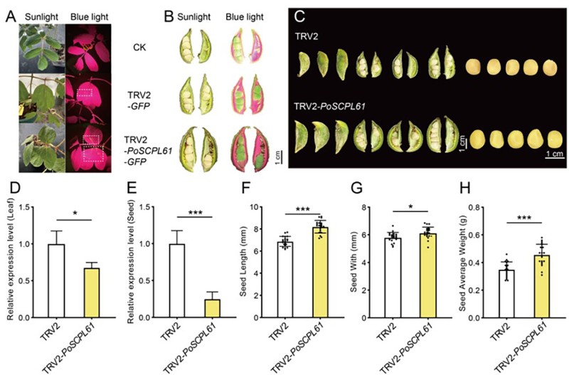 图4. 沉默PoSCPL61后促进凤丹种子变大。(A) 沉默PoSCPL61后蓝光下凤丹叶片荧光图。(B) 沉默PoSCPL61后蓝光下凤丹种子荧光图。(C)沉默PoSCPL61后牡丹果荚和种子的表型变化。(D) - (E) qRT-PCR分析基因表达。(F)种子长度统计。(G)种子宽度统计。(H)种子重量统计。