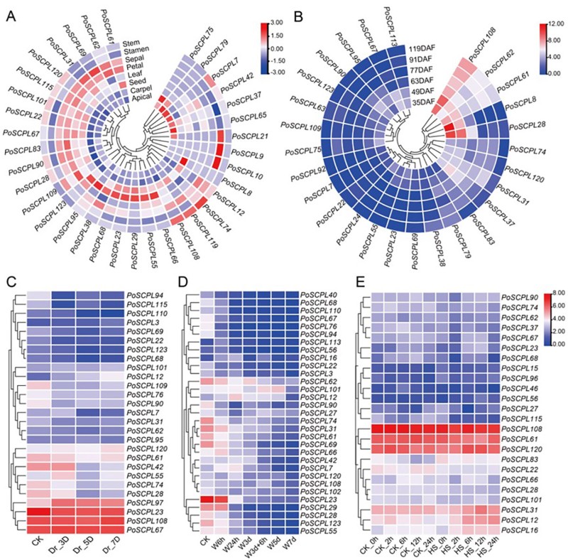 图2.PoSCPLs在8个组织、种子发育阶段、干旱、淹水和高温胁迫下的表达谱。(A) 8个组织,(B)种子发育6个阶段,(C)干旱胁迫,(D)淹水胁迫,(E)高温胁迫