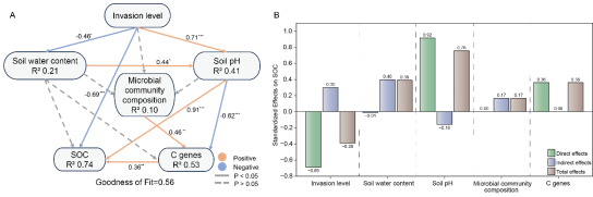 (二)毛竹入侵显著降低了土壤细菌群落多样性与网络复杂性,抑制了与碳循环相关的关键功能基因,导致土壤有机碳含量显著降低。通过Meta分析进一步验证了毛竹入侵普遍导致土壤有机碳含量降低的趋势。表明毛竹入侵通过改变土壤理化性质削弱微生物碳循环潜力,从而影响森林碳汇功能。该研究成果以“Soil Organic Carbon Decline under Bamboo Invasion: The Role of Microbial Carbon Cycling”为题发表于国际学术期刊Journal of Environmental Management(IF5-year :8.6)上,中国科学院华南植物园鼎湖山站硕士研究生孟楚舒为论文第一作者,周曙仡聃副研究员为通讯作者,刘菊秀研究员参与指导。该研究得到国家自然科学基金、广东省重点研发计划等项目资助。文章链接:https://doi.org/10.1016/j.jenvman.2025.127999