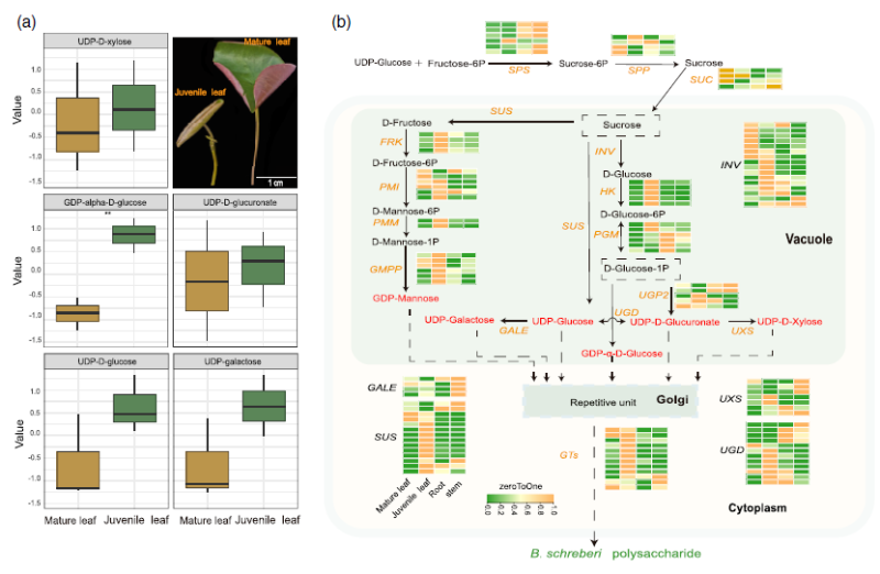 · 黏胶质合成机制: 研究首次解析了莼菜幼叶表面“果冻状”黏胶质的合成路径。发现其采用独特的能量分配模式:成熟浮水叶通过光合作用生产蔗糖,经SUC转运蛋白输送至水下幼叶,转化为前体GDP-葡萄糖,最终由糖基转移酶催化合成富含多糖的黏胶质,以抵御机械损伤与微生物侵染。