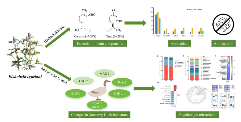 相关研究成果以Dietary supplementation with herbal powder of Elsholtzia cypriani improves immune function in Muscovy ducks by activating endogenous antioxidant system and modulating gut microbiota为题,发表于国际期刊Poultry Science;并已申请国家发明专利“一种用于提高鸭免疫性能的饲料”。中国科学院昆明植物研究所周慧伟为论文第一作者,杜芝芝为该论文通讯作者。该研究得到了福建省科技厅STS项目(2023T3074),以及合作单位漳州昌龙农牧有限公司、福建省农业科学院、昭通市农业科学院的支持。
