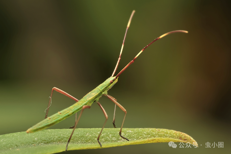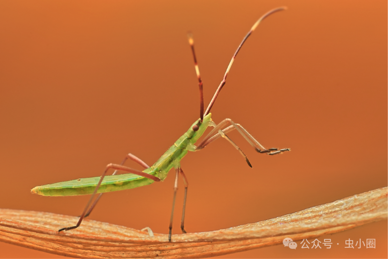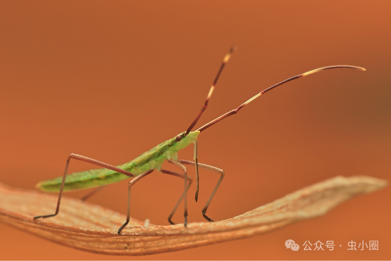 这是稻田里的中稻缘蝽,处于高龄阶段,身材苗条,体色鲜绿,六足纤细,触角灵活。成虫已在往期分享过了,有兴趣可点链接:中稻缘蝽
