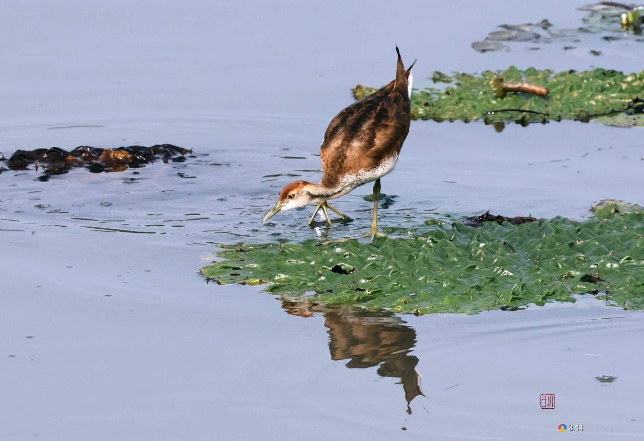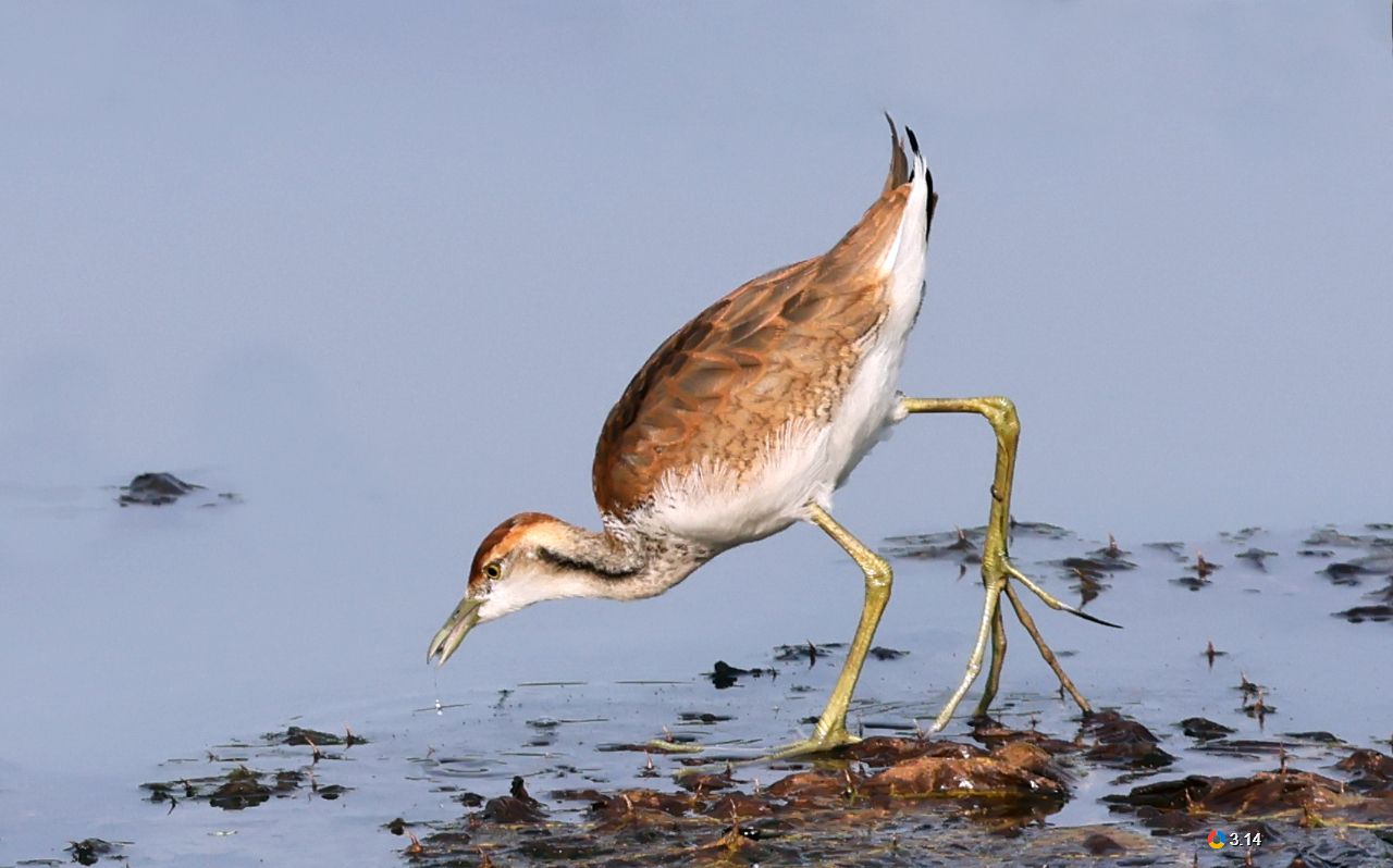 它们拥有极长的脚趾,能很好地分散体重,从而优雅地在芡实的浮叶上行走,用细长的喙翻找和啄食叶片上、水面或浅水中的食物。