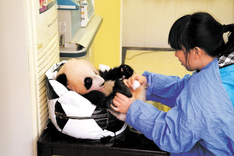 许林护理大熊猫幼崽。中国大熊猫保护研究中心供图