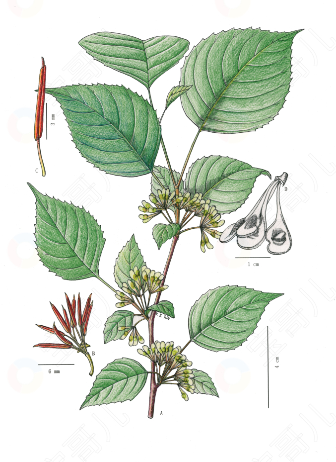 领春木科领春木属落叶灌木或小乔木,高可达15米;小枝无毛,芽卵形,鳞片深褐色,光亮。叶纸质,卵形或近圆形,少数椭圆卵形或椭圆披针形,先端渐尖,脉腋具丛毛,叶柄有柔毛后脱落。花丛生;苞片椭圆形,早落;花药红色,比花丝长,子房歪形,翅果棕色,种子卵形,黑色。4-5月开花,7-8月结果。