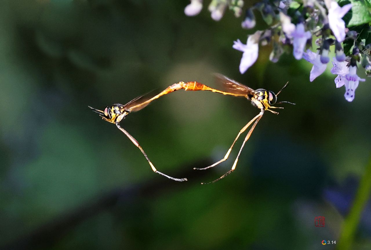 姬蜂虻是双翅目蜂虻科昆虫,具有显著拟态姬蜂的形态特征,成虫体长2-3厘米,常见黑黄相间条纹,头部具棒状触角与复眼,虹吸式口器适应花蜜吸食。它的奇特之处,一是极不协调的大长腿,二是“拟态”,装成带毒螫的蜂,其实并不能蜇人;三是交配时的空中“双人”舞,可停,可进,可退,像“空中芭蕾”或“爱的探戈”。