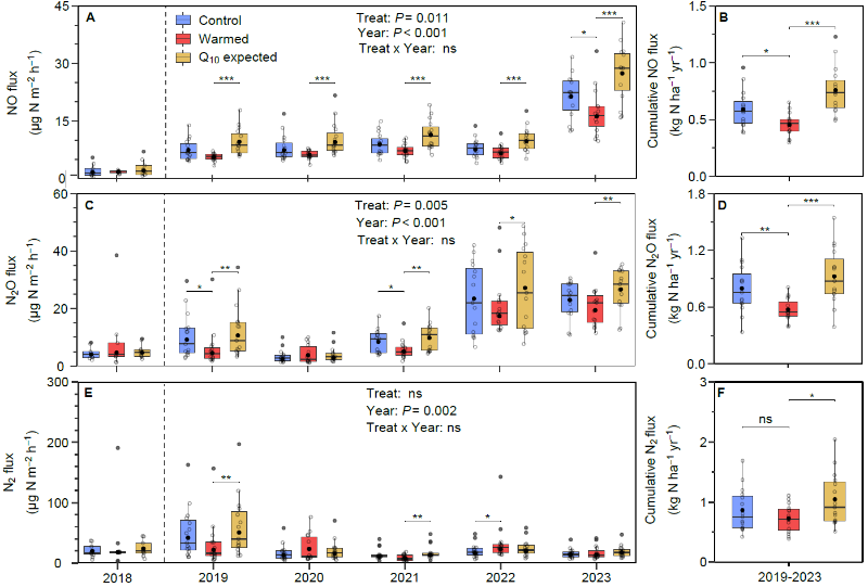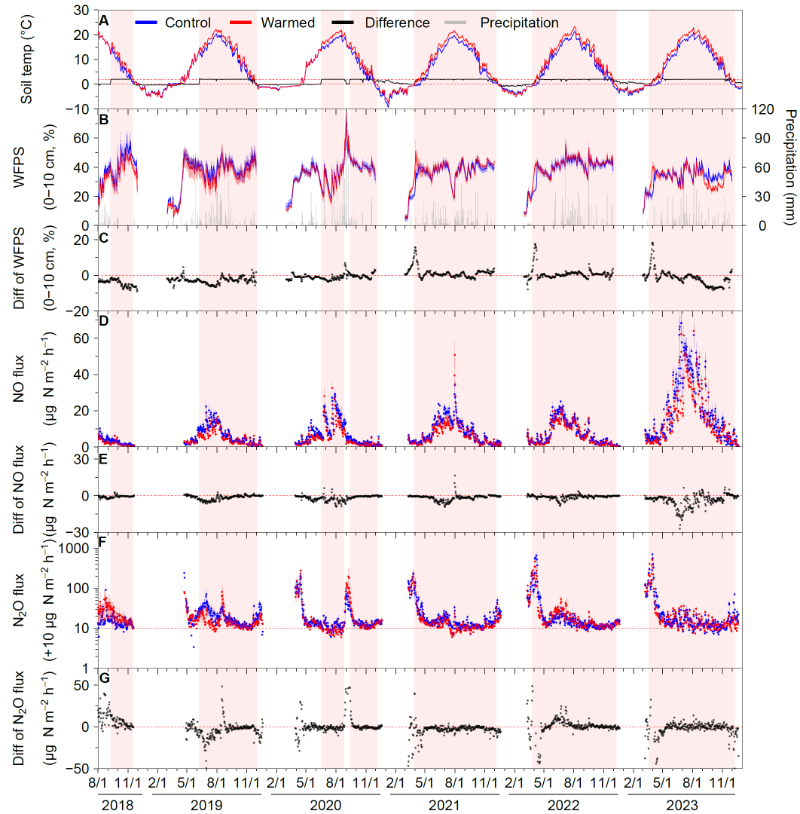 氮(N)是植物初级生产力和森林碳固存能力的关键限制性营养元素,全球变暖预测将通过气态途径加速森林生态系统N损失,从而降低N可利用性。森林土壤气态氮排放主要包括一氧化氮(NO)、氧化亚氮(N2O)和氮气(N2),其总量可占森林大气氮输入的一半。目前,大多数模型对土壤氮排放的温度响应预测仍基于实验室热力学理论(如阿伦尼乌斯方程),认为氮排放速率随温度呈指数上升。然而,这类理论缺乏长期、原位的实地验证。迄今为止,全球有10个森林生态系统开展了原位N2O排放的增温研究,而针对NO和N2的野外观测仍是空白,这使得增温情景下气态氮排放的整体响应及其机制尚未得到系统厘清。气温升高通过直接改变微生物代谢速率及间接影响土壤水分共同调控气态氮排放。因此,开展长期野外增温的高频观测对于揭示温度与水分对土壤氮循环的耦合控制机制、提高陆地碳氮循环模型的预测能力具有重要科学意义。