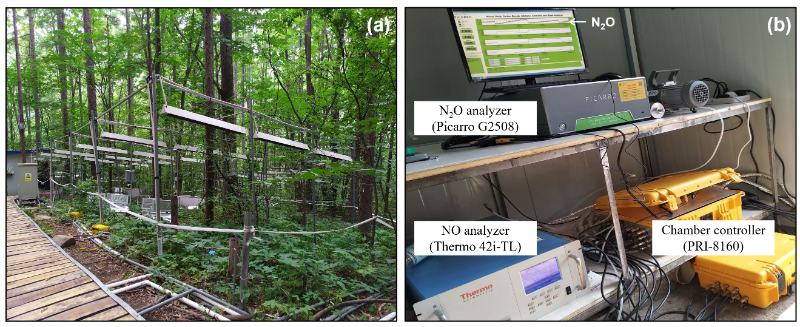 基于此,中国科学院沈阳应用生态研究所稳定同位素生态学团队依托在辽宁清原森林生态系统国家野外科学观测研究站−清原森林野外增温平台,建立了土壤NO和N2O排放速率的自动采样和测定系统(由30个土壤呼吸室、自动控制系统、NO-NO2-NOx和Picaro G2508分析仪组成),并对增温下森林土壤气态氮排放进行了连续六年的高频观测(图1)。