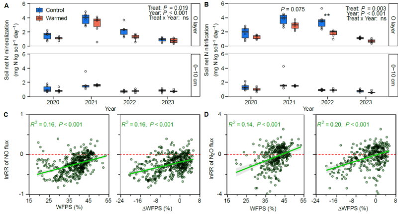 在六年观测期间,我们累计获得约20万次土壤NO和N2O的通量(图2),并估算了N2排放。与热力学理论预测相反,增温2°C使森林土壤NO和N2O排放分别降低了19%和16%(图3)。与此同时,增温显著抑制了有机质层土壤氮循环相关过程:有机质层土壤微生物氮、可溶性有机氮、净氮矿化和硝化速率分别下降6%、12%、21%和14%。进一步分析表明,气态氮排放的减少并非由于完全反硝化还原为N2(功能基因nosZ和估算的N2释放均未显著增加),亦非土壤淋溶或植物吸收增加造成,而是源于升温引起的土壤干燥限制微生物活性与氮转化速率(图4),这一机制与年降水量低于1000 mm的其他温带森林增温实验结果相一致,表明在温带地区,土壤水分的变化可能主导未来森林生态系统氮排放对气候变暖的响应。