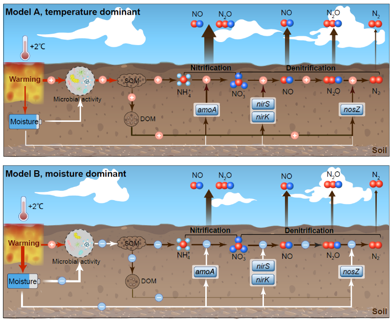 图5.森林土壤气态氮排放对变暖响应的概念模型。