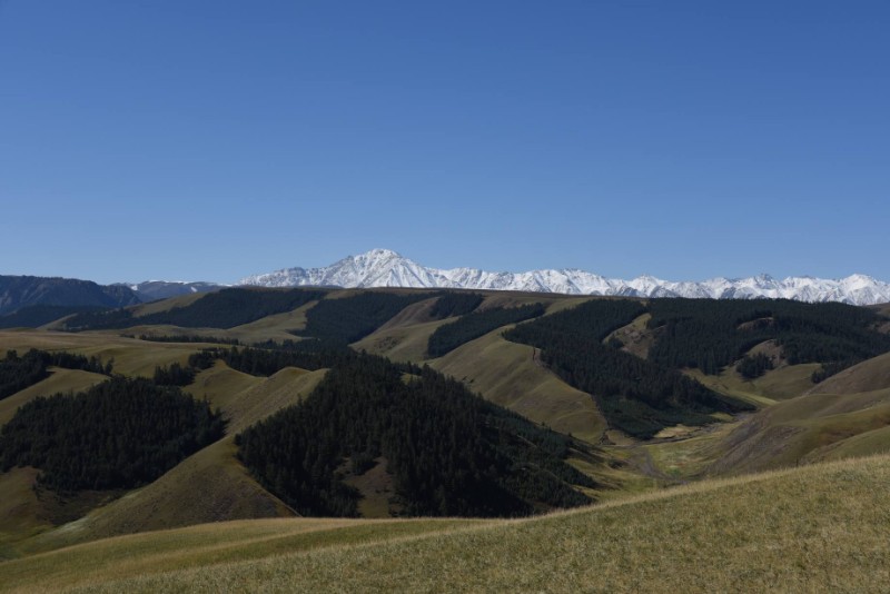 蓝天之下,雪山沉默矗立,如同大地的坐标,标记着这片土地的高度与纯净。而山脚下,森林如墨绿的屏障,草坡如温润的地毯,层层叠叠,从雪线之下一直铺展到视野的边际。这是一片被精心守护的、充满层次与秩序的土地。