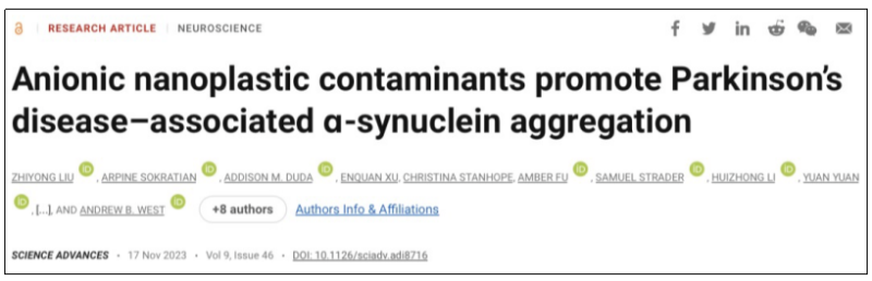 2023年11月,发表在《科学进展》上的研究显示,纳米塑料能够进入大脑,与神经元中的蛋白纤维发生作用,从而加剧帕金森病的风险。