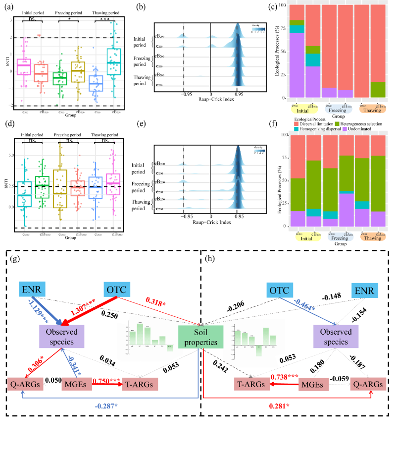为解决上述问题,中国科学院沈阳应用生态研究所环境生态工程创新组群,基于为期两年的田间试验,系统探究了耐冷细菌Herbaspirillum huttiense(H. hutt)在自然冻融条件下对ARGs的削减效果,并阐明了其削减ARGs的微生物作用途径。研究结果发现,在土霉素-恩诺沙星复合污染环境下,冻融交替会影响土壤结构,加剧ARGs由表层向深层积累,扩增倍数高达50.48倍;而接种H. hutt可有效抑制ARGs增殖,扩增倍数限制在6.44倍。施用H. hutt后会富集Hymenobacter等有益菌属并抑制Flavisolibacter、Blastococcus等ARGs宿主增殖,通过重构微生物互作网络削减ARGs丰度。该过程中,微生物群落装配由随机过程主导转向确定性过程主导,异质选择的贡献从11.73%提升至64.33%。此外,H. hutt通过降低土壤总氮和电导率等环境因子,限制了Nocardioides、Blastococcus等ARGs宿主的生长,促进tetW、tetQ、tet(PA)等ARGs削减。该研究基于田间试验揭示H. hutt通过“生态过滤—生态位重构—环境调控”三位一体的综合作用机制,有效遏制冻融条件下ARGs的传播与积累。研究结果为寒冷地区农业土壤中ARGs的微生物修复提供了新思路与理论支撑,强调了微生物修复技术在调控土壤微生态与ARGs传播中的重要作用。