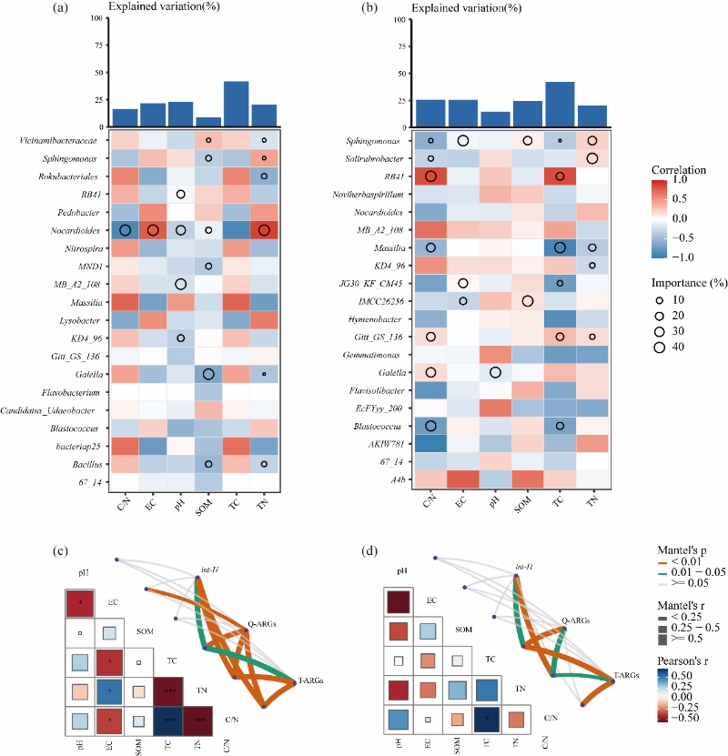 图2 融化期ARGs、微生物群落与环境因素之间的关系。随机森林模型评估了第一年(a)和第二年(b)土壤环境变量与优势细菌属相对丰度之间的相关性。Mantel test分析评估了第一年(c)和第二年(d)ARGs与环境因子之间的相关性。