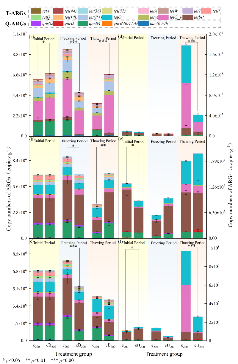 图1 在e200和eB200处理土壤在初始阶段、冻结阶段和解冻阶段中四环素类ARGs和氟喹诺酮类ARGs的绝对拷贝数。(a–c)分别为第一年在0–10cm、10–20cm和20–30 cm土层深度的ARGs拷贝数;(d–f)为第二年不同土层深度的基因拷贝数。