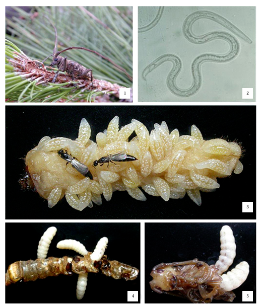 图3 松褐天牛肿腿蜂雌蜂及其所繁殖的后代幼虫寄生在松褐天牛幼虫体上
