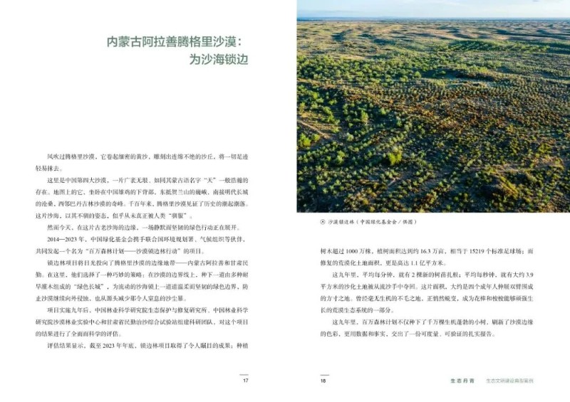 近日,由国家林业和草原局宣传中心联合中国林业出版社组织的“贯彻落实‘两山’理念典型案例征集展示活动”结果公布,中国绿化基金会“百万森林”品牌“沙漠锁边林”项目成功入选生态文明建设典型案例,并被收录于《生态丹青——生态文明建设典型案例》一书,正式出版发行。