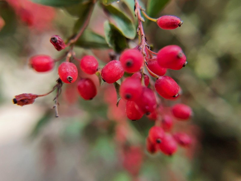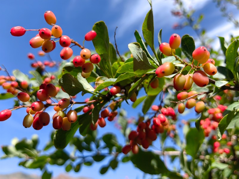 那些圆润的果实顶端,细小的黑点宛若自然的印章,记录着从青涩到绯红的整个季节。椭圆形的叶片依然保持着深沉的绿色,在霜雪将至的时节里坚持着光合作用的使命。这种红与绿的对话,并非简单的色彩对比,而是生命在不同形态间达成的默契:叶片用最后的叶绿素守护着果实,果实则以饱满的糖分回馈这场守护。在这海拔三千米以上的高原,每一种颜色都成为生存的宣言。