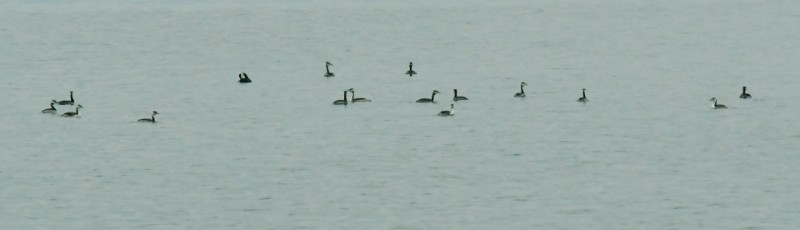 在异龙湖,凤头鸊鷉一般只栖息在离岸边较远的深水区域觅食,躲在“深闺”不露面,人们很难看到它的容颜。今年亦不例外,12月初,监测人员在异龙湖南岸白浪渔歌片区对野生鸟类进行日常监测时,在距离岸边约300米远的水域面,监测到36只凤头䴙䴘。它们悠哉游荡于湖面上觅食,时而集群聚在一起,时而分散。相比于小鷿鷈,颈部长,体型较大,潜水时间长,它和水面上的白骨顶、小䴙䴘、紫水鸡、苍鹭、斑嘴鸭、白鹭等鸟类共处在一个片区,互不冒犯干扰,悠然自得游荡潜水觅食。它靠近岸边约20米的水域面,边觅食边警惕用眼睛环视着岸上行人。凤头鸊鷉左右来回在水域面慢慢搜索游荡觅食,它游荡间,它不时把身体慢慢潜入水中,一会儿啄出罗非鱼,一会儿啄出黄辣丁,一会儿啄出虾子,待填饱肚子,它们三三两两聚在一起,扇动双羽或梳妆打扮。生态廊道上,骑车、散步行人来来往往,遇有人多嘈杂声干扰,它们迅速游离岸边进入湖中间,避开人群,确保自身安全,遇有人少安静时,它再又慢慢靠近岸边,潜水啄鱼啄虾充饥。