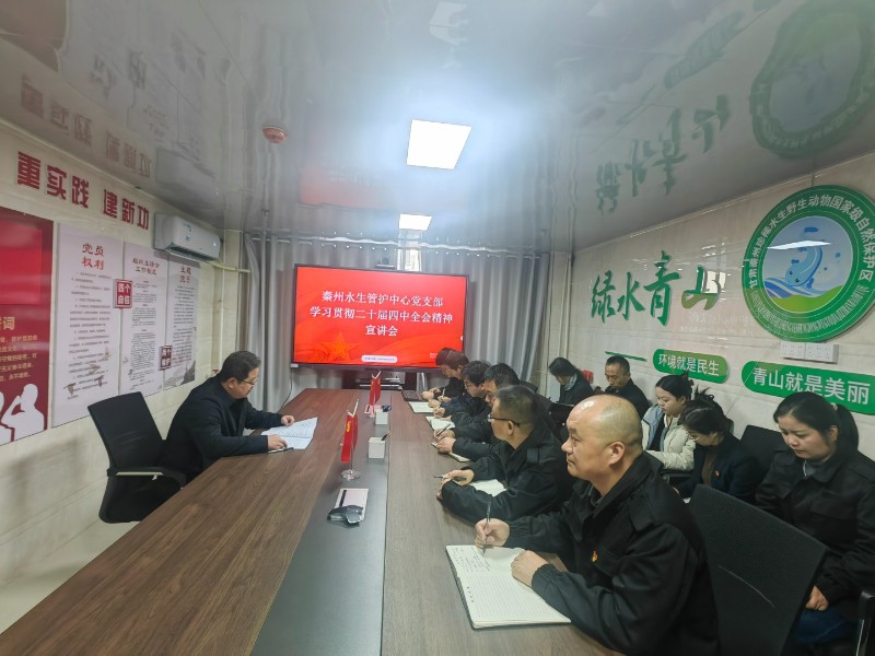 12月1日,秦州水生管护中心召开专题宣讲会,党支部书记、主任王晓龙以“谱写生态保护新篇章,推动人与自然和谐共生”为主题,向全体干部职工深入解读党的二十届四中全会精神,推动全会部署与生态管护工作深度融合。