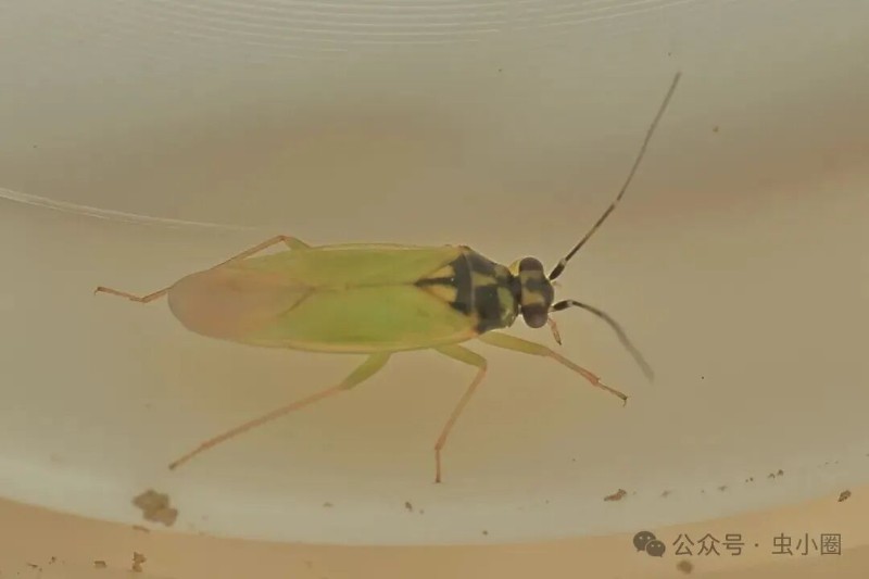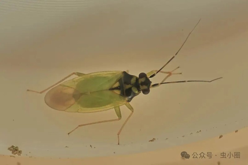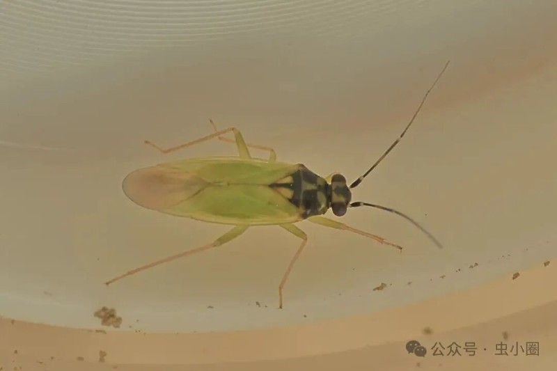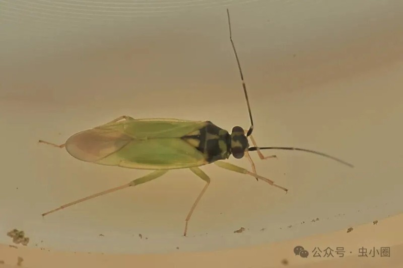 触角是辨认黑肩绿盲蝽身份的重要特征:总共4节,第一节端部保留着和身体一致的黄绿色,其余部分则是油亮的黑褐色,黑白相间的模样,像精心设计的“条纹装饰”。黑肩绿盲蝽的翅膀、腹部和足均为黄绿色,这种配合稻田调配的保护色,让它们完美隐没于稻叶与稻秆之间。头部中央点缀着一抹醒目的黑褐色斑纹;复眼是深邃的黑褐色,没有单眼,全靠这对复眼洞察周围动静。