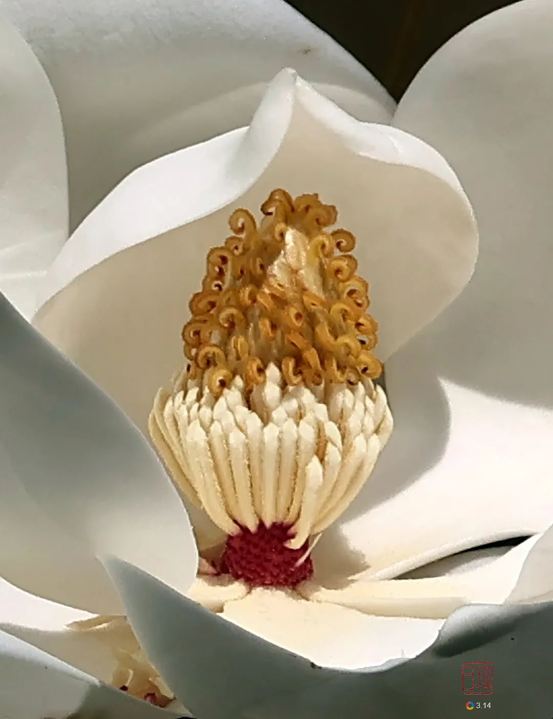 荷花玉兰的雌蕊群位于花托上方,无柄;雄蕊群位于雌蕊群下方,成熟后自然脱落。这种结构有利于传粉,雌雄蕊分离可减少自花授粉的可能性,提高异花授粉效率。