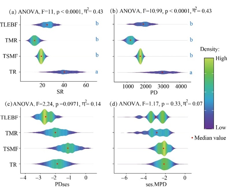 中国科学院西双版纳热带植物园(以下简称“版纳植物园”)植物系统发育与多样性保护研究团队以西双版纳地区的热带雨林、热带季雨林、热带季节性湿润林与热带低山常绿阔叶林等四种森林类型为研究对象,分析比较了不同森林类型之间在物种多样性SR、系统发育多样性PD、标准化系统发育多样性PDses与标准化种间平均距离ses.MPD等方面的差异,在此基础上运用非度量多维尺度分析与逐步多元分析等方法,解析了影响该地区不同森林类型多样性差异的环境驱动因素。