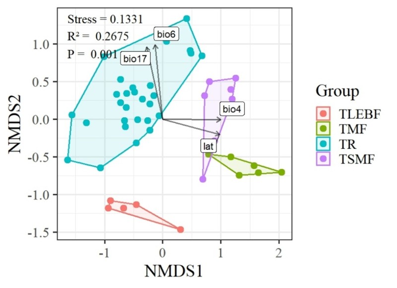 研究发现,不同类型的森林在多样性上表现出鲜明特征。热带雨林具有最高的物种多样性和系统发育多样性,而热带季节性湿润林虽然在物种多样性上不占优势,但其标准化系统发育指标最高。进一步分析表明,四个森林类型的分布格局与物种组成、气候、土壤与地形等因素密切相关,且在多样性指标与环境相关性分析中这四类因素表现显著,反映了环境过滤对不同森林的分布及其多样性差异发挥着关键作用。其中,热带雨林和热带季节性湿润林的分布与多样性对温度、降水和土壤条件更为敏感,提示了这两类森林在未来气候变化下可能会面临更大的多样性丧失风险。研究基于多维生物多样性指标,比较了不同森林类型之间的多样性差异,并揭示了重要环境驱动因素,为深入理解西双版纳地区生物多样性分布格局、优化自然保护区规划与管理提供了科学依据。