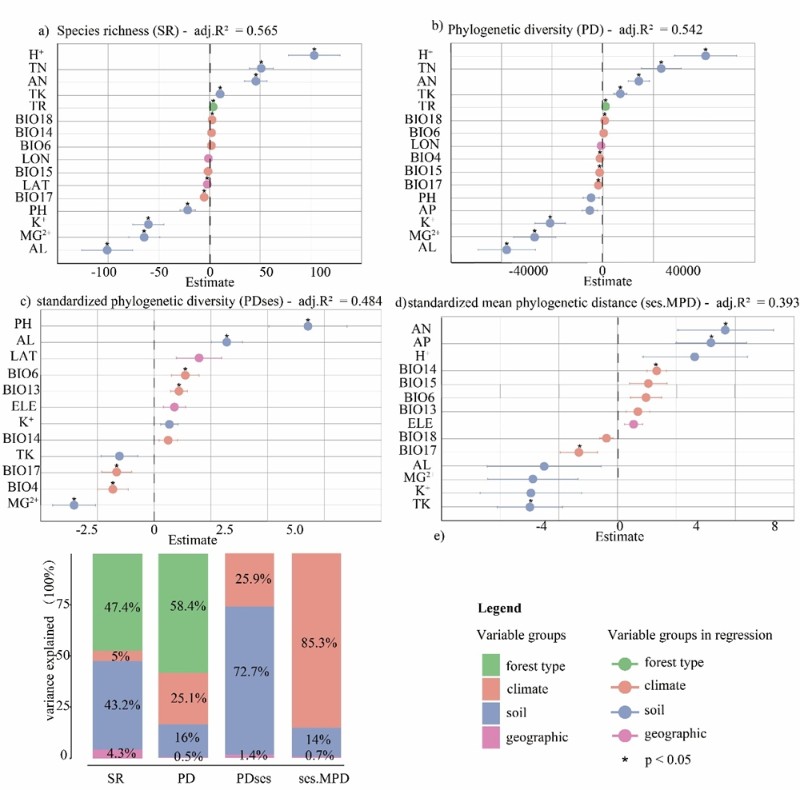 图3生物多样性指标与环境之间的逐步多元回归系数图与贡献率