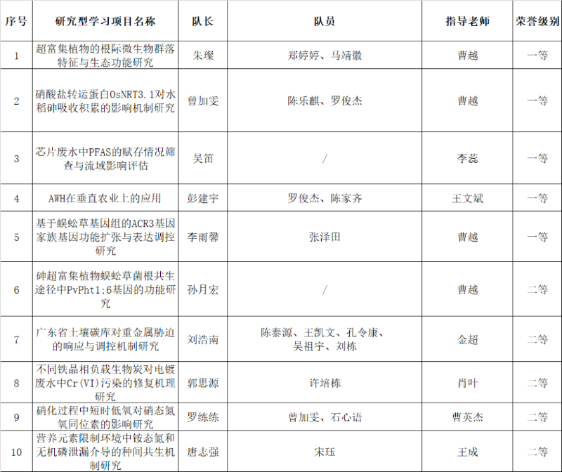 根据《中华环境保护基金会TOTO水环境专项基金中山大学环境科学与工程学院奖学金资助办法》,经学生组建团队申报、立项、结题,学院组织评定,本着“公平、公正、公开”及“优中选优”的原则,评选出中山大学研究型学习奖学金获得者名单如下:
