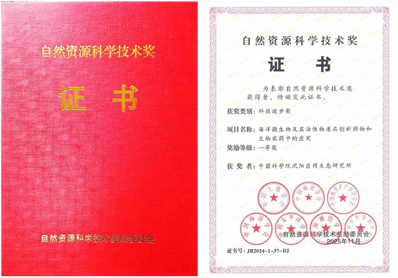 沈阳生态所参与的“海洋微生物及其活性物质在创新药物和生物农药中的应用”成果获2025年自然资源部..