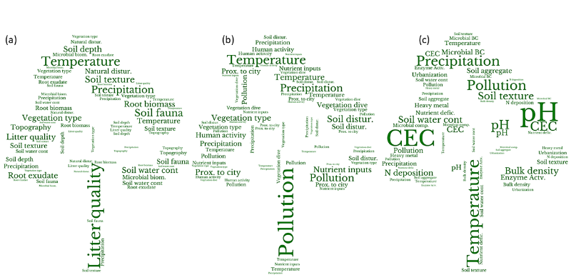 图3.在城乡梯度上影响土壤有机碳稳定性的关键因素:农村森林(a)、郊区森林(b)和城市森林(c)