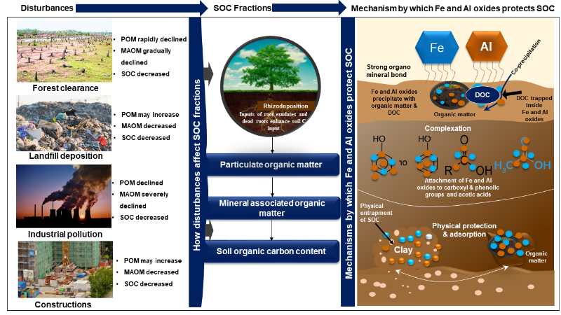 图2.人为干扰对土壤有机碳组分的影响以及铁铝氧化物稳定有机碳的机制。