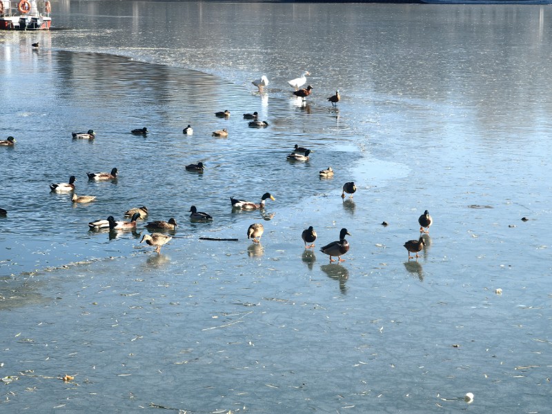北京紫竹院公园冬日的湖面半冰半水,像块被阳光揉碎的玻璃。野鸭们是这里的主角:有的浮在残波里划开细纹,有的踩在薄冰上缩着脚,白鹅混在棕褐羽色间,成了最软的光斑。船舷浸在寒气里,碎冰随波纹轻撞,连风都慢下来,陪这群小家伙把冷冬过成闲趣。