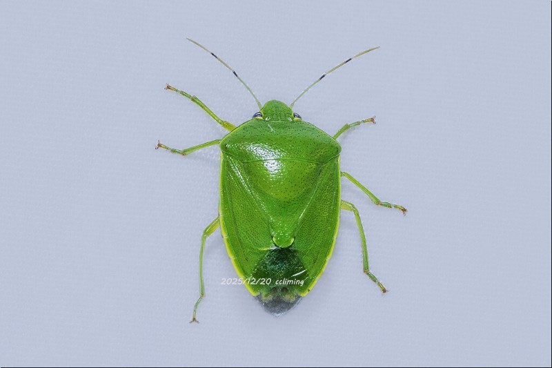 · 绿艳青蝽。如其名,是今夜的一抹亮色。通体是带着金属光泽的翠绿色,仿佛披着翡翠薄甲,每个刻点都像精心镶嵌的绿宝石。可以想象,它在叶间停驻时,几乎与嫩叶融为一体;此刻在灯下,则流转着温润如玉的光泽。