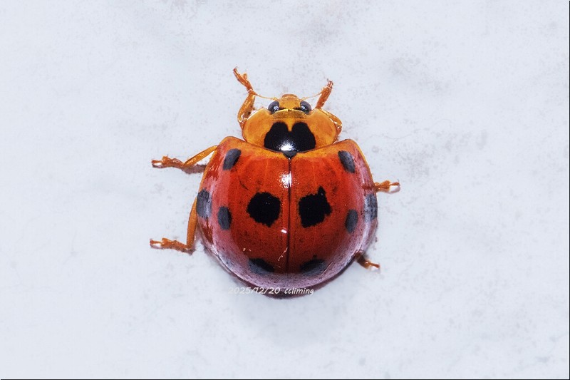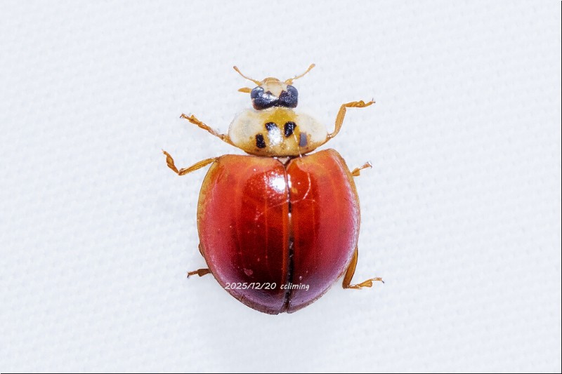 · 红肩瓢虫。其配色确有独特风致。鞘翅是鲜艳明亮的赤红,如同冬日里难得的一捧暖色;在这赤红的底色上,疏落有致地点缀着大小不一的黑斑。在灯光映照下,那红是温润的釉色,黑是沉静的墨点,红黑相映,既热烈又端雅。