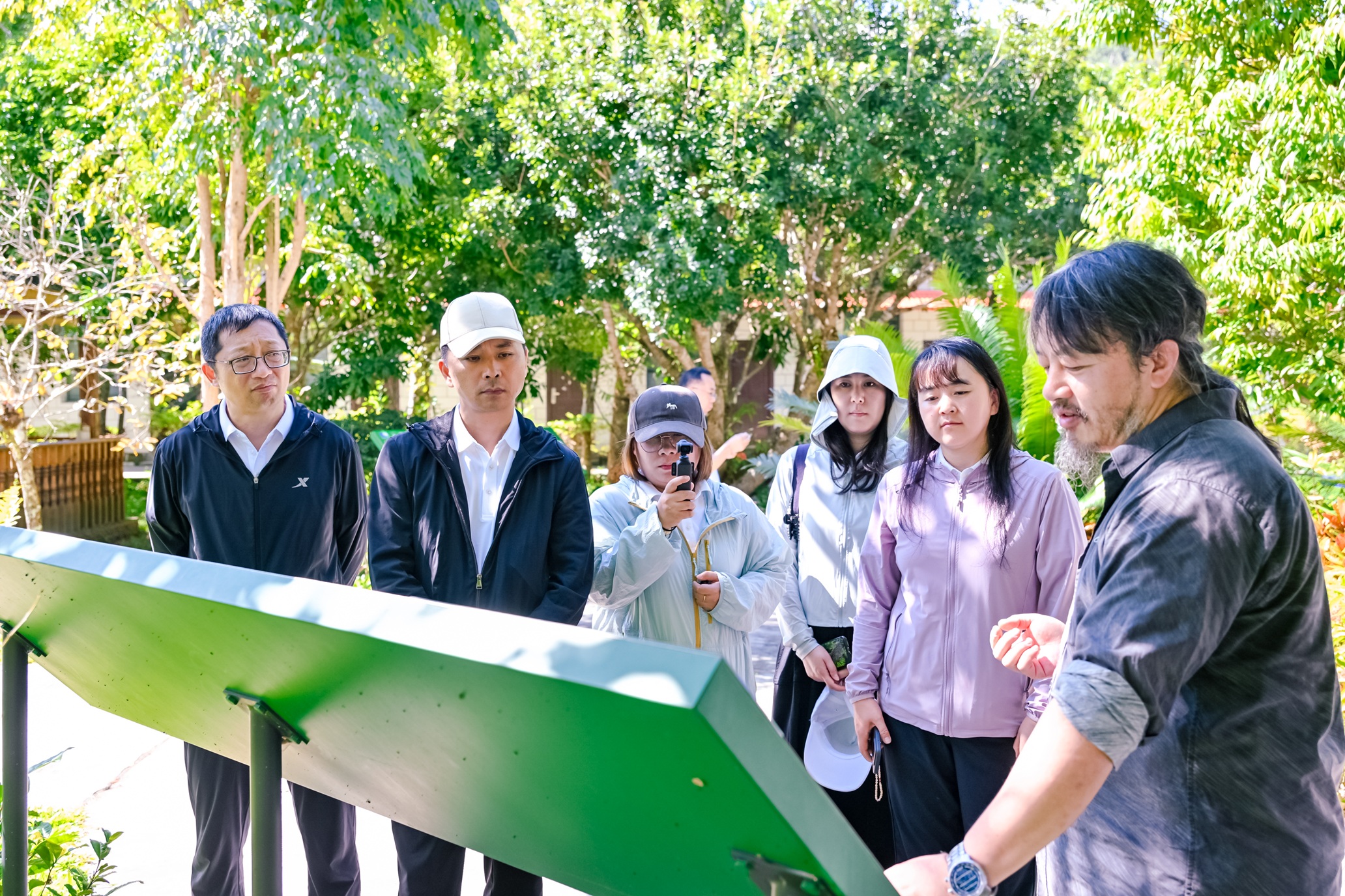在自然教育基地,探访团成员观看科普展板,了解西双版纳的自然生态特征、保护区的工作成果,以及保护区常规开展的十大类保护工作和不同的保护项目。其中,独具创意的物种标识牌引起众人关注。