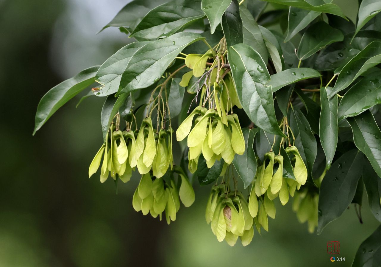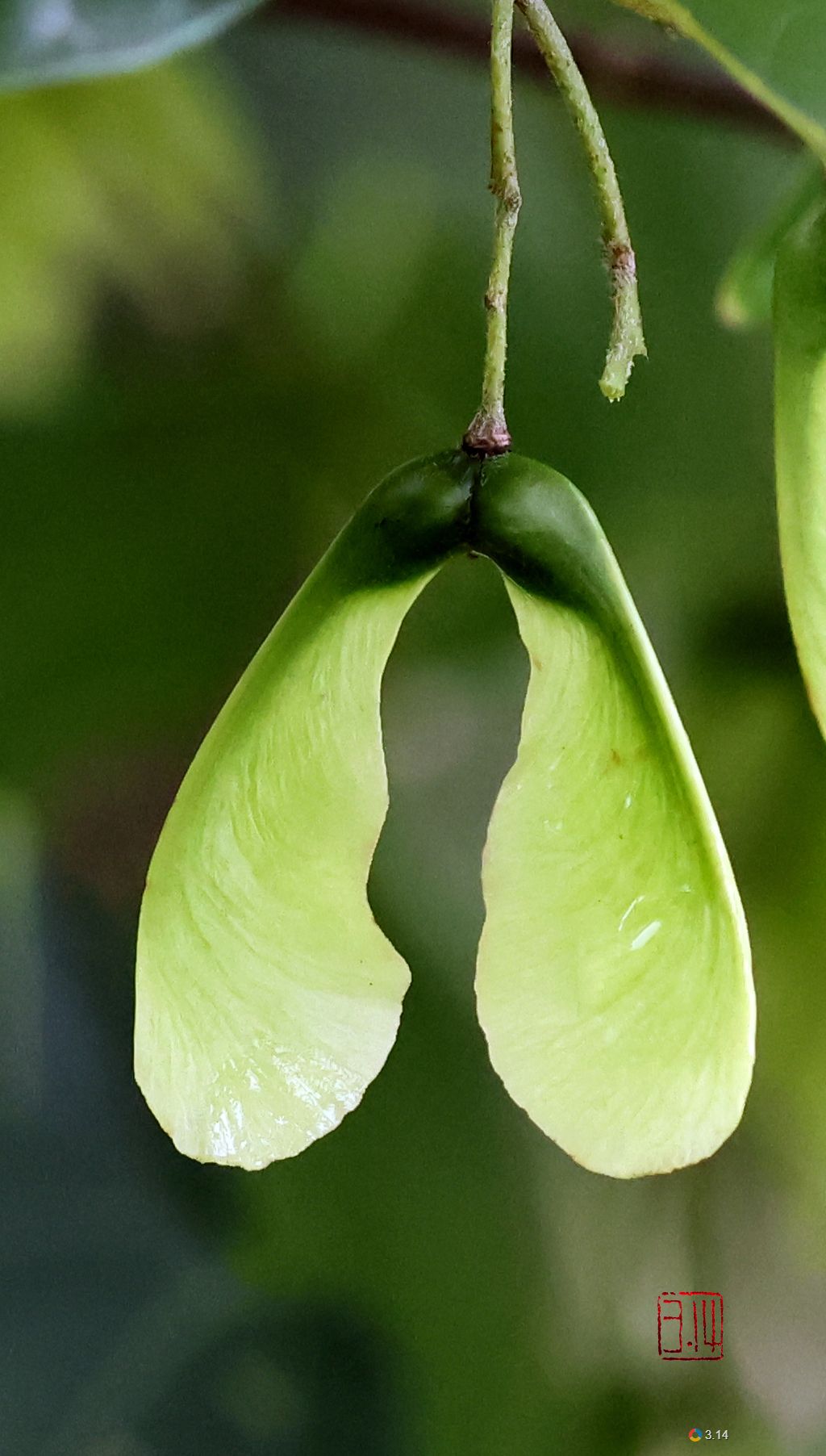 欧亚槭,学名Acer pseudoplatanus,中文常被称为假挪威槭或西卡莫槭。欧亚槭的种子最引人注目的特点就是它的翅果形态。种子通常成对出现,每一粒种子的末端都带有一片薄而宽的、膜质的“翅膀”。这两片翅膀以一定的角度(通常接近60-120度)连接在一起,形成一个整体结构。当种子从母树上脱落时,双翅结构会使它像直升机螺旋桨一样快速旋转,这使得风能将种子带到离母树更远的地方,有助于物种避开竞争,在新的地点萌发生长,一阵强风可以将种子带到数百米之外。