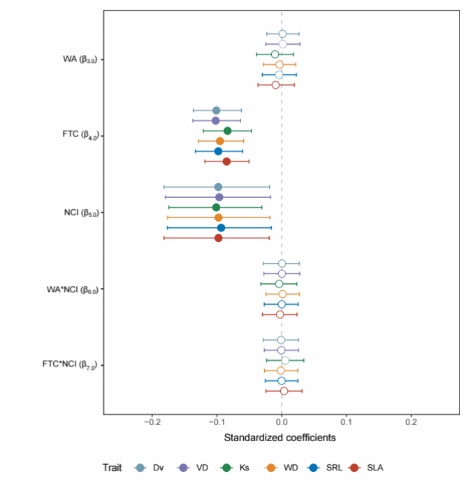 图1.夏季水资源可用性(WA)、冬季冻融循环(FTC)、邻近拥挤度(NCI)及其相互作用对树木生长速率的影响。