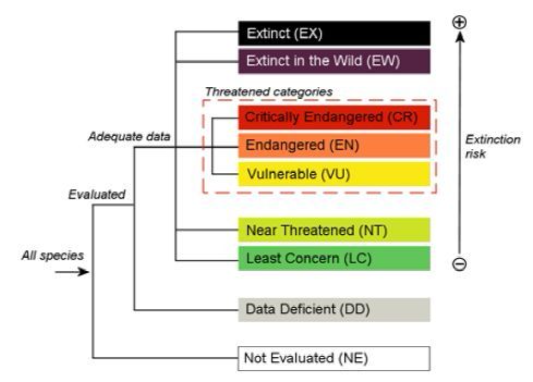IUCN红色名录将物种保护级别分为九类,从高到低依次为: