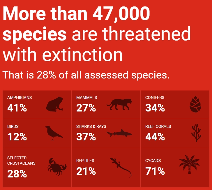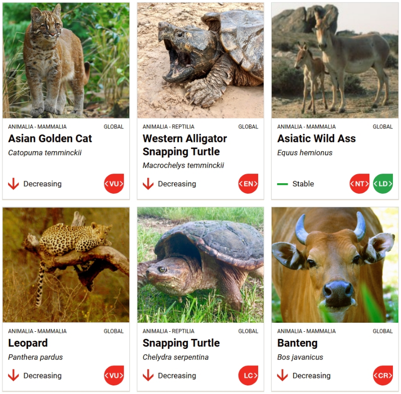 迄今为止,已经对包括哺乳动物、两栖动物、鸟类、造礁珊瑚和针叶树在内的许多物种群进行了全面评估。除了评估新发现的物种外,世界自然保护联盟红色名录还重新评估了一些现有物种的状况,有时还会讲述积极的故事。例如,由于保护工作,一些物种被列入世界自然保护联盟红色名录类别规模,因此被降级(即改进)。然而,坏消息是生物多样性正在下降。目前,世界自然保护联盟红色名录上有超过169,000种物种,超过47,000种物种面临灭绝威胁。